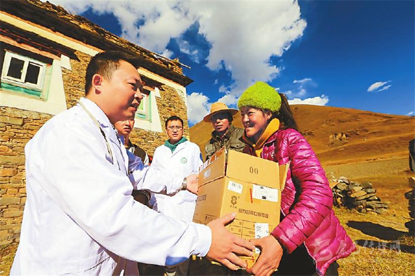 右圖:2016年11月2日,遂寧市中心醫(yī)院派駐康定市人民醫(yī)院的城鄉(xiāng)醫(yī)療對口支援醫(yī)療隊(duì),深入新都橋鎮(zhèn)呷巴鄉(xiāng)自弄村特困戶彭措拉姆(右一)家義診,并向她捐贈了衣物。 (資料圖片)