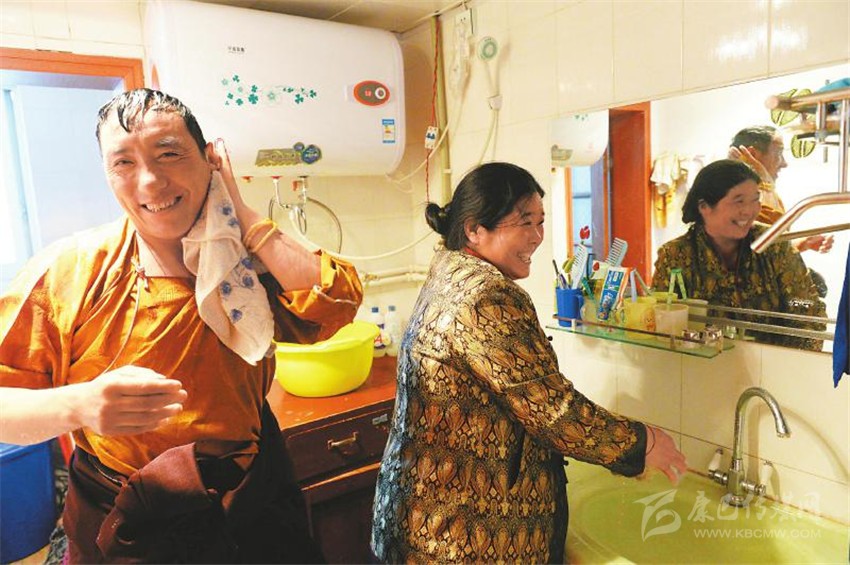 左圖:理塘縣高城鎮(zhèn)長壽街的牧民丹珍(右)和丈夫洛絨鄧珠在家里用上了干凈的自來水。